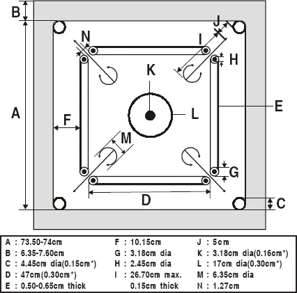 These shall be drawn so as to touch both the base lines and also the upper base lines of the adjacent side when imaginably extended. The distance between the base circle on one side and that of the other may be 1.27 cm approximately.