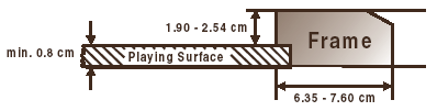 The playing surface of the Carrom Board shall be of plywood or of any other wood equally smooth and be of not less than 8 mm in thickness and of a minimum of 73.50 cm and a maximum of 74 cm square with its surface completely smooth. A Carrom Board shall be able to have at least three and a half runs of a normally smooth striker of 15 gms weight, when struck with the maximum force, from one of the base lines, to the opposite frame of the Carrom Board.