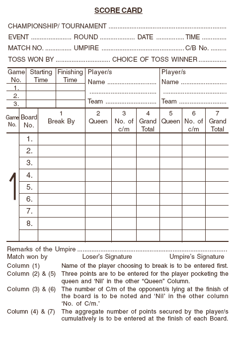 - ‘Board’ shall mean from the commencement of a board, after Umpire calls ‘Play’ till its completion on pocketing of last C/m of any player.